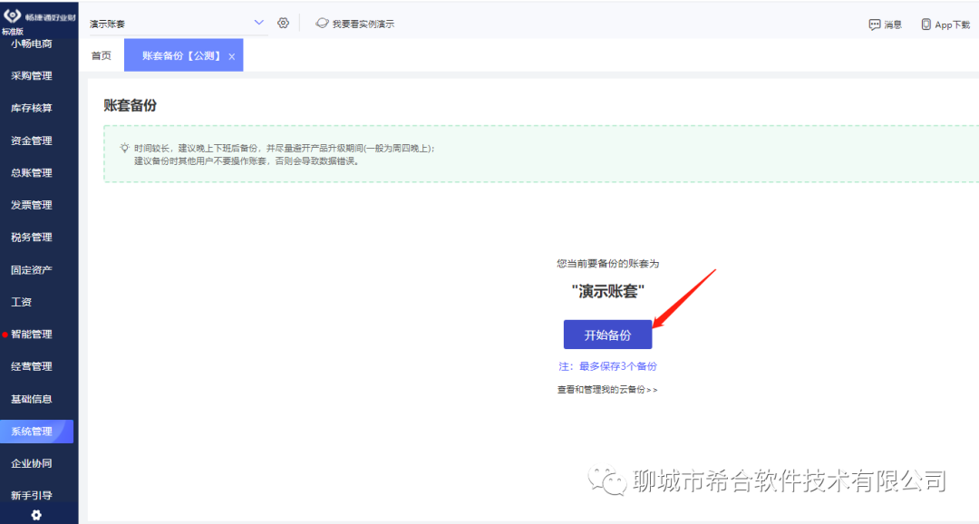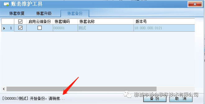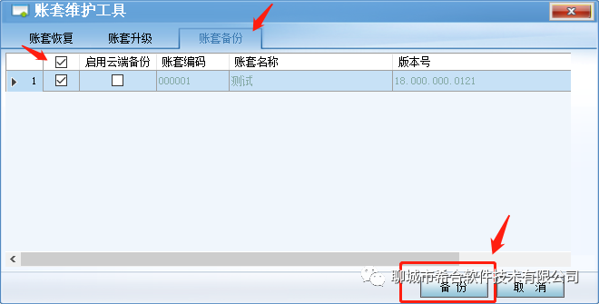 2.点击账套备份,勾选账套,点击备份。