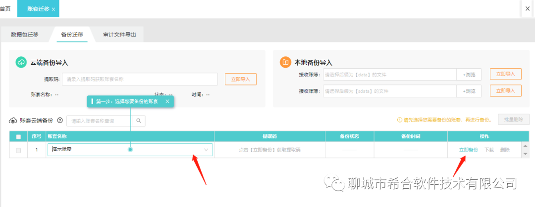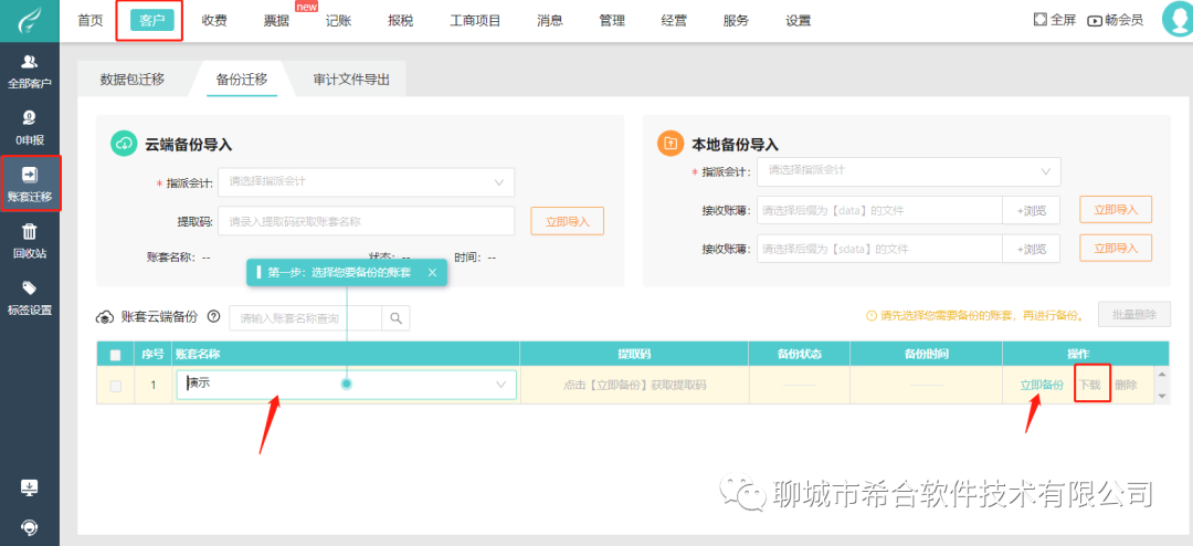 客户--账套迁移--备份迁移--选账套---立即备份,下载到本地。